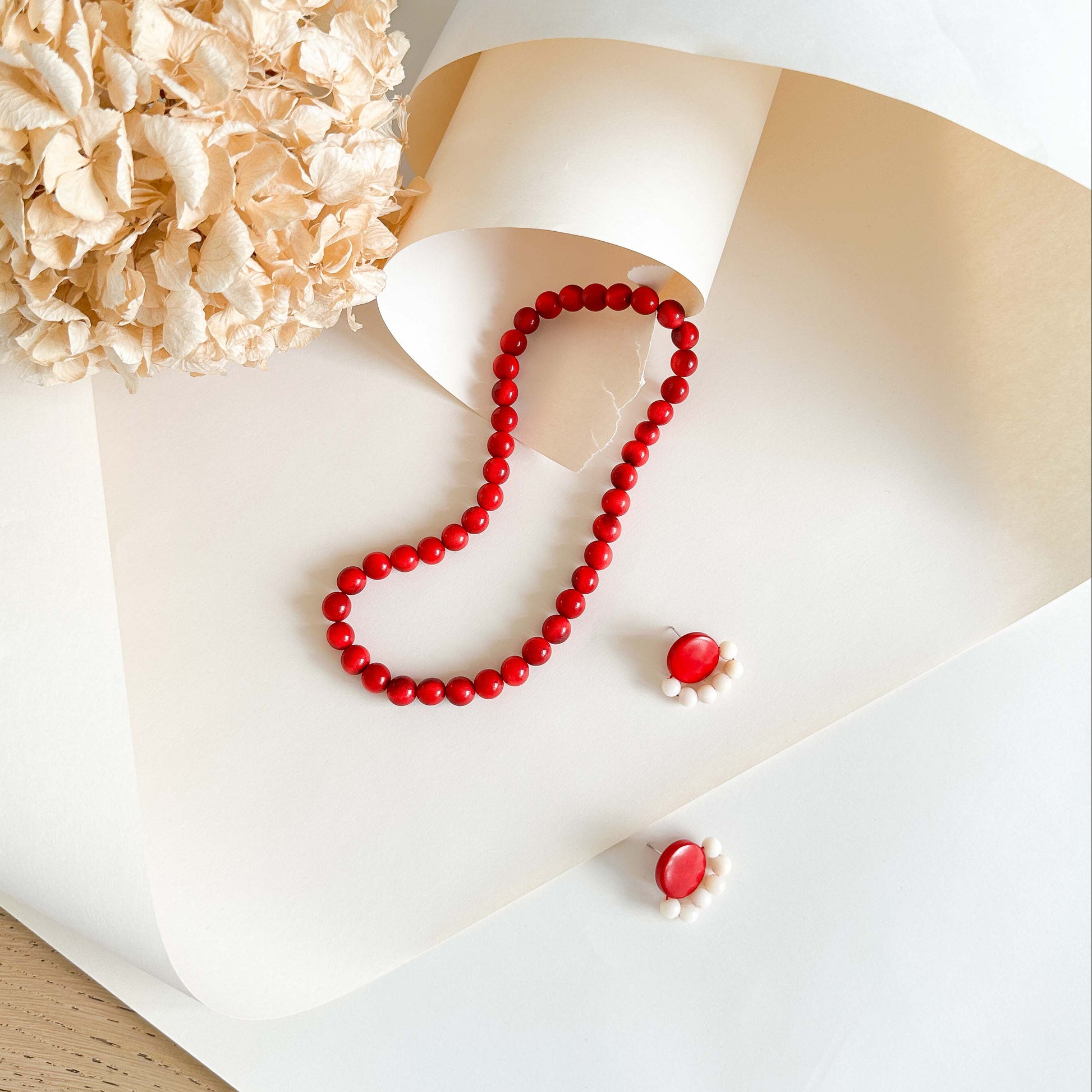 Dette settet er håndlaget av bærekraftige tagua-nøtter og blander naturlig eleganse med lett komfort. Det tidløse halskjedet (45 cm) passer uanstrengt til ethvert antrekk, mens de delikate Marni-øredobbene (28 mm, hypoallergenisk stål) gir en subtil, moderne gnist.