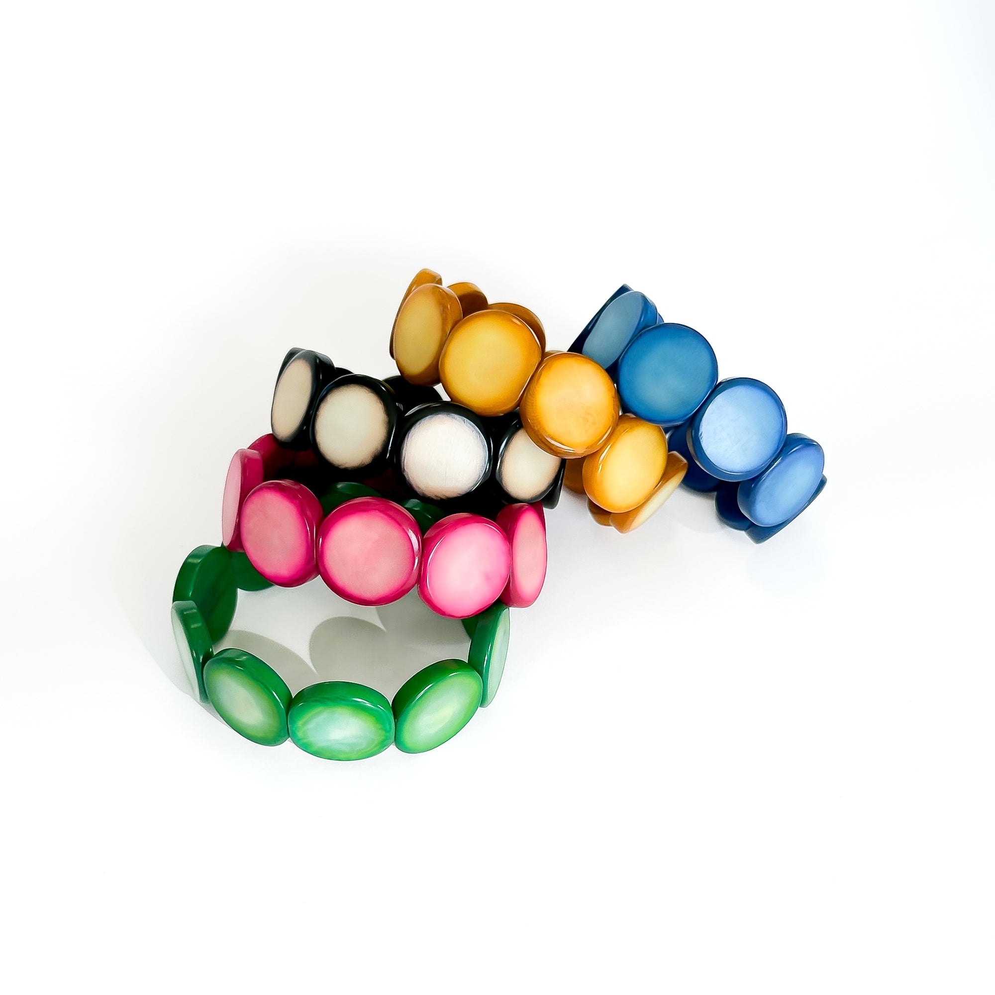 ArmbåndAlle armbåndene våre er håndlaget med bærekraftige tagua-nøtter. En perfekt kombinasjon av farger og naturlig skjønnhet, laget med omsorg for miljøet.
